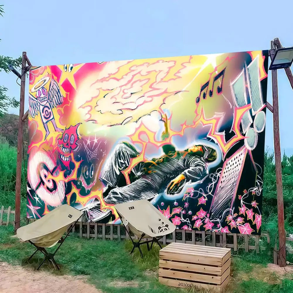 Telo da parete ispirato al mondo di Tony Boy, perfetto per dare un tocco unico alla tua stanza. La grafica è pazzesca, piena di dettagli e colori che richiamano le sue migliori vibes. Puoi appenderlo ovunque: in camera, in studio, o anche per feste e shooting.